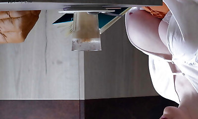 Waitress gets internal cumshot in her cream colored pussy under the table